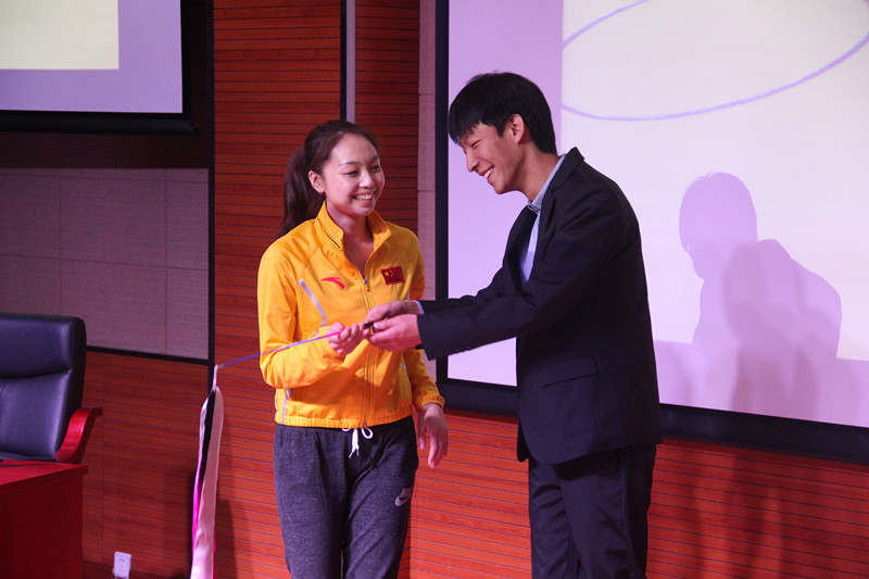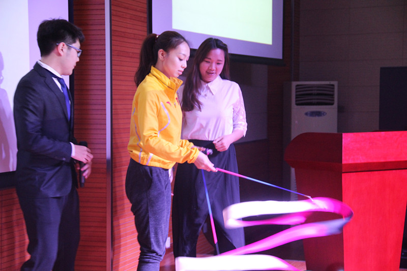 学生做出演讲,以自身经历向到场师生展示体育人努力、拼搏的精神,激励在场同学为梦想而努力。活动现场,两位冠军还与在场观众亲密互动,现场教授艺术体操体育用具的使用方法。杨伊琳同学在演讲完毕后,回答京商金贝娱乐城